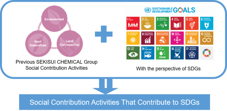 SEKISUI CHEMICAL Group promotes social contribution activities in the three main areas of “environment”, “next generation”, and “local community”. In addition, we are promoting social contribution activities that contribute to the creation of a sustainable society aimed at by the SDGs (Sustainable Development Goals) as “SDGs Contribution Activities”.